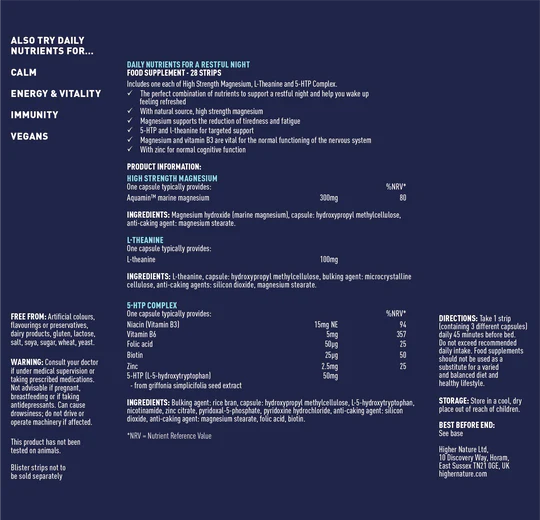 Daily Nutrients for a Restful Night 28’s is a carefully formulated nighttime support supplement from Kyjani, designed for adults of all ages who struggle with late-night anxiety, nighttime restlessness, or fatigue due to poor-quality sleep. Each nightly strip contains three powerful capsules packed with natural magnesium, L-theanine from green tea, and a brain-boosting 5-HTP complex fortified with essential B vitamins and zinc.