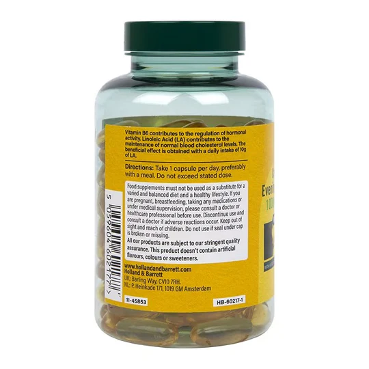 Holland & Barrett Evening Primrose Oil 1000mg Capsules is a powerful natural wellness supplement enriched with vitamin B6 and vitamin E – designed to support hormonal balance, skin health, and reduce fatigue. Extracted using cold-press technology for maximum purity, each capsule delivers consistent results backed by science.