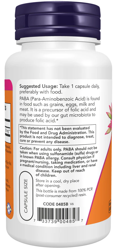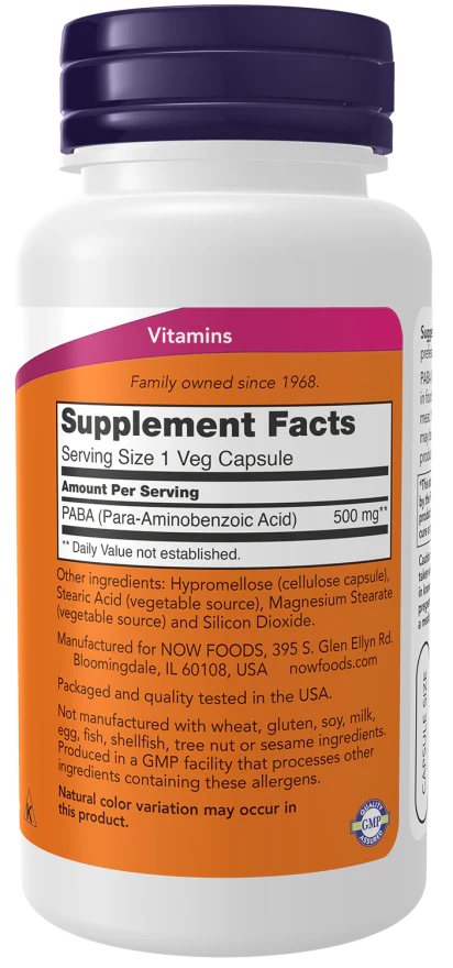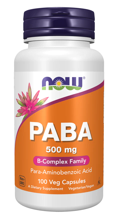PABA Capsules 500mg by NOW Foods delivers high-potency Para-Aminobenzoic Acid – part of the vitamin B-complex family – known for its role in skin health, tissue repair, and supporting folic acid metabolism in the gut. With 100 capsules per bottle, this supplement offers targeted support in daily doses that are both precise and convenient.