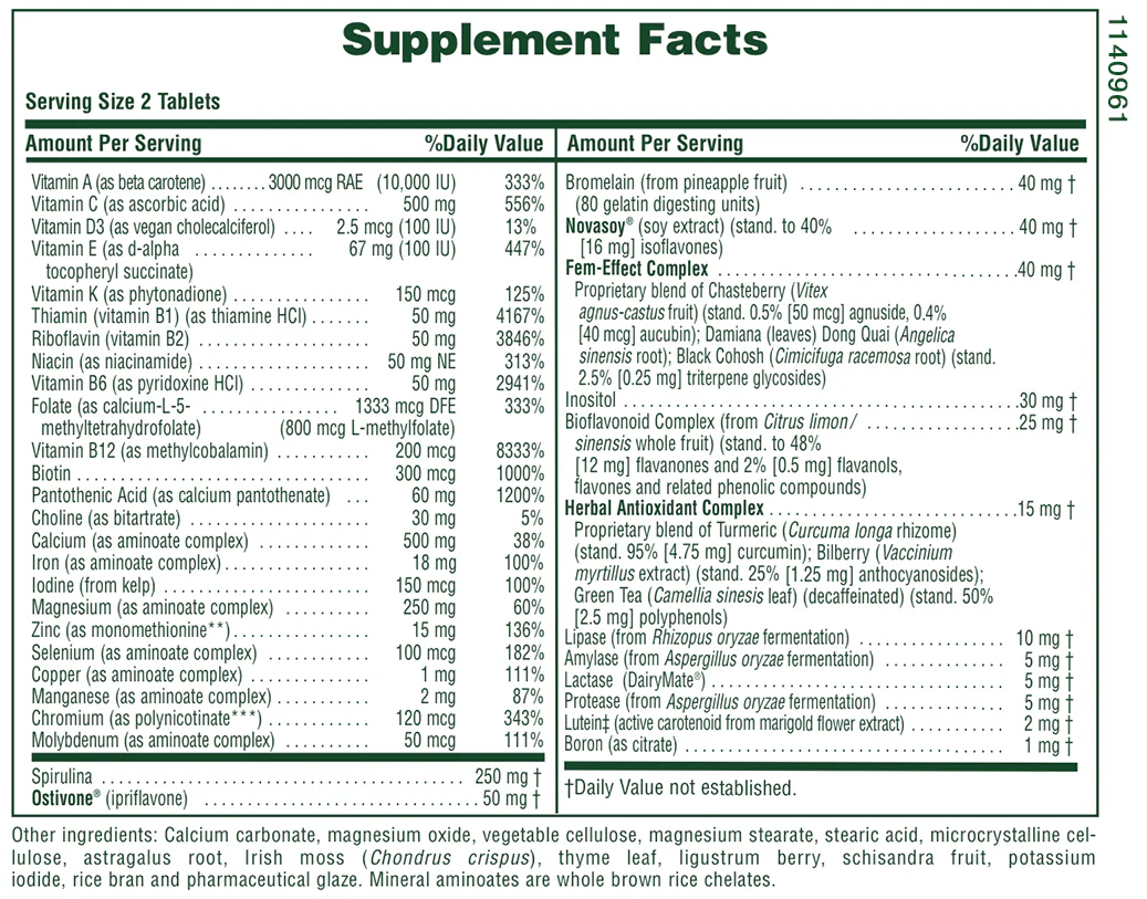 This formulation combines bioavailable vitamins and chelated minerals that work at the cellular level. Iron boosts hemoglobin production to fight fatigue, while B-vitamins help convert food into energy. Herbal compounds like Dong Quai and Green Tea Extract support hormonal balance and offer antioxidant protection, especially important for women facing hormonal shifts around menstruation or menopause.